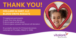 Las Vegas Blood Drive Supporting Vitalant Las Vegas: The Holland & Hart Foundation’s Las Vegas office hosted a blood drive on March 5 in partnership with Vitalant Las Vegas, welcoming the Vitalant Bloodmobile to our location. With 13 registered participants, including 4 first-time donors, the drive collected 10 life-saving blood donations. Every two seconds, someone in the U.S. needs blood, and Vitalant works to collect more than 4,500 donations daily to meet patient needs. We are proud of our volunteers for helping transform the lives of patients in the Las Vegas community.